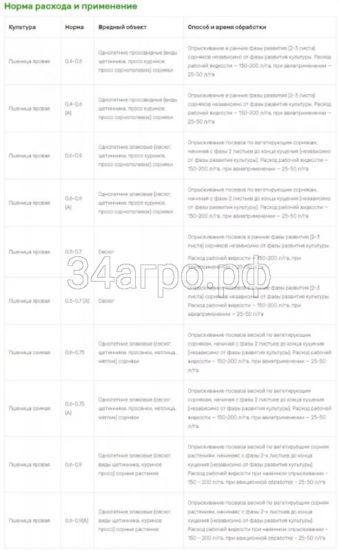 Пшеница яровая | 0,6-0,9 | Однолетние злаковые (овсюг, виды щетинника, куриное просо) сорные растения | Опрыскивание посевов весной по вегетирубщим сорням растениям, начинаяс с фазы 2-х листьев до конца кущения (независимо от фазы развития культуры). Расход рабочей жидкости при наземном опрыскивании – 150 – 200 л/га, при авиционной обработке – 25-50 л/га |