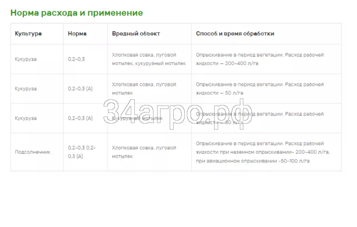 Кукуруза | 0,2-0,3 (А) | Хлопковая совка, луговой мотылек | Опрыскивание в период вегетации. Расход рабочей жидкости – 50 л/га |