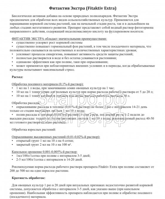 FITAKTIV Extra является стимулятором роста и адаптогеном, неспецифически действующим как на растительные клетки, так и на клетки грибов и бактерий, получен путём взаимодействия индолилмасляной кислоты с гидратированным фуллереном. Биологическое действие обусловлено ускоренным перемещением остатка ИМК к рецепторам за счёт высокого сродства молекулы фуллерена к биохимическим структурам.